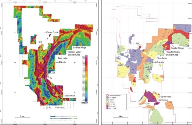 Scarlet Knob is 1 km further southwest of Scarlet Valley and displays similar size and attributes to Scarlet Valley. Extensive geologic mapping and sampling is currently underway at Scarlet Knob and Tarn Lake, yet further south, to more fully explore this area. Eskay thinks it is possible that there is up to 8.5 km of VMS mineralization along the full Scarlet Ridge trend.