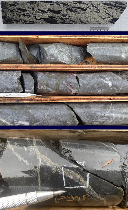 (Figure 1: Examples of sulfide stockwork feeder mineralization encountered in recent drilling at Jeff target. Gold colors are pyrite. Fine grains of tetrahedrite, a silver sulfosalt mineral, occurs interstitial to pyrite in the upper photo. Bright red spots in the lower photos are pyrargyrite, also a silver sulfosalt mineral.)