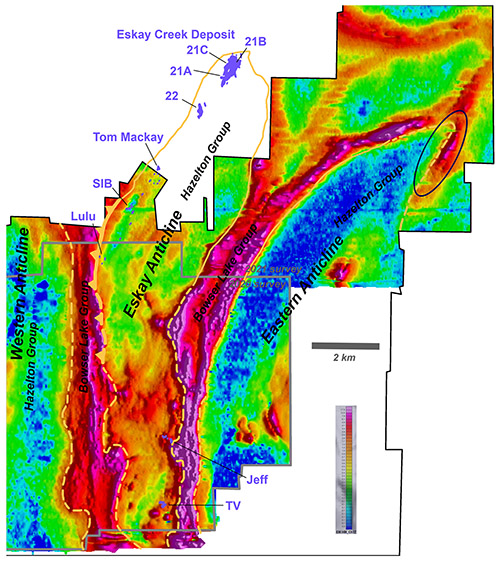 (Figure 2: SkyTEM data from the northern part of Eskay’s project area. Cool colors are resistive rocks. Warm colors are conductive rocks. The contact between highly conductive Bowser Lake Group sedimentary rocks and the more resistive Hazelton Group volcanic rocks is readily apparent, in orange (solid where mapped and dashed where inferred; thick with teeth denotes thrust faulting). It is along this contact and areas of Hazelton Group rocks below that Eskay Mining considers prospective for precious metal-rich VMS mineralization. Thus, the eastern side of the Eskay anticline is considered highly prospective from Jeff to the Eskay Creek mine.)