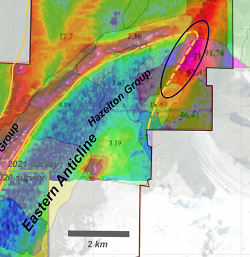 - SkyTEM data from the western limb of the Eskay anticline provides a complete picture of the Bowser Lake Group-Hazelton Group contact. This contact is believed to be structural through most of this area with Bowser Lake Group rocks thrust faulted over Hazelton Group rocks. This said, strong Au BLEG anomalies are present where this contact trends southward. It is possible that the relation of these two units again becomes unconformable in this area making it prospective for precious metal-rich VMS deposits. Complete SkyTEM data from the southern region is needed to make further interpretations about this area.