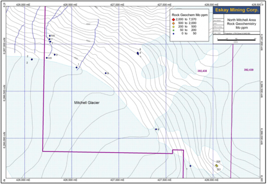 Figure 10: Results of Mo assays for rock chip samples from the 2016 prospecting program in the southwestern portion of the North Mitchell claims.