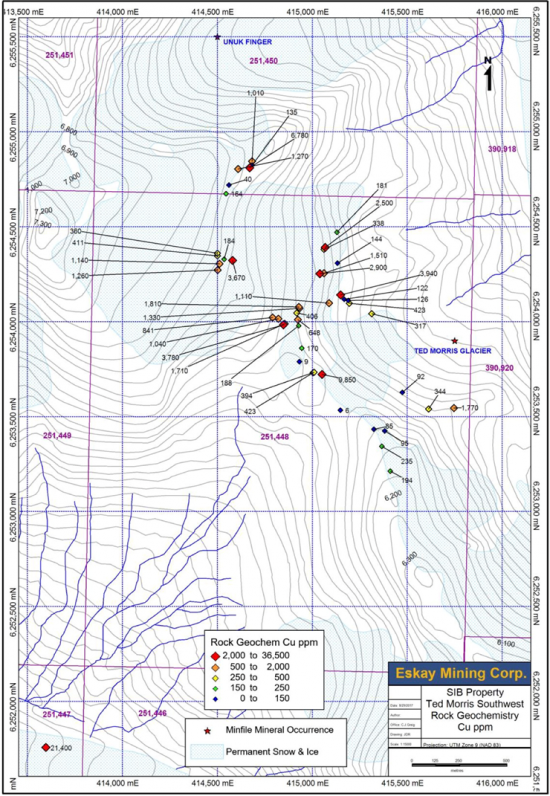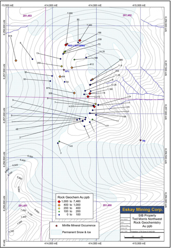 The North Mitchell and Ted Morris showings lie along a larger northeast-southwest trend of Cu-Au porphyry deposits that includes KSM, Iron Cap, and Treaty Creek (Figure 1) that comprise a total indicated Au resource of over 100 million ounces, and a Cu resource of over 20 billion pounds. Prospecting and BLEG surveys of North Mitchell, Big Red, and Ted Morris shows high Au and Cu concentrations associated with the chalcopyrite, bornite, and chalcocite. BLEG anomalies between Ted Morris and Kerr suggest that this area has widespread potential for Cu-Au porphyry deposits.