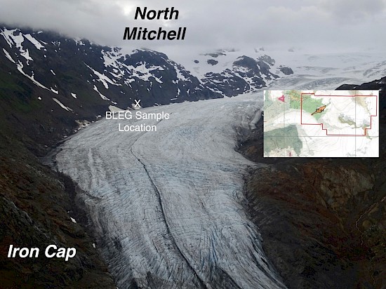 The North Mitchell claims cover 14.5 square kilometers adjacent to the KSM Cu-Au-Ag-Mo deposits and the Valley of the Kings gold deposit (Brucejack), and is 19 km southeast of the Eskay Creek precious metals-rich VMS deposit. Much of North Mitchell is steep and glaciated however there is considerable exposure north of Mitchell Glacier (Figure 5) where prospecting and BLEG sampling have been conducted. The southwestern part of North Mitchell hosts lower Hazelton Group andesites and associated sedimentary rocks (Figure 6), the same host rocks as the precious metal-endowed Valley of the Kings, Iron Cap, Mitchell, and Treaty Creek deposits. BLEG sampling shows a strong 27.64 ppb Au anomaly, from the single drainage that was able to be sampled in this rugged area. Prospecting of this area conducted in 2016 identified strongly anomalous Au, Ag, Cu, and Mo concentrations (Figures 7-10) associated with veins of quartz, chalcopyrite, and bornite. This mineralogy is consistent with porphyry-style mineralization.