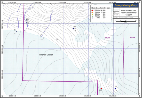 Figure 9: Results of Cu assays for rock chip samples from the 2016 prospecting program in the southwestern portion of the North Mitchell claims (1,000 ppm=0.1%).