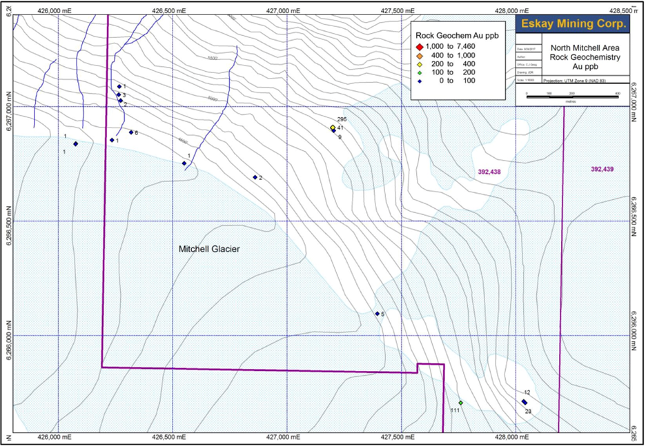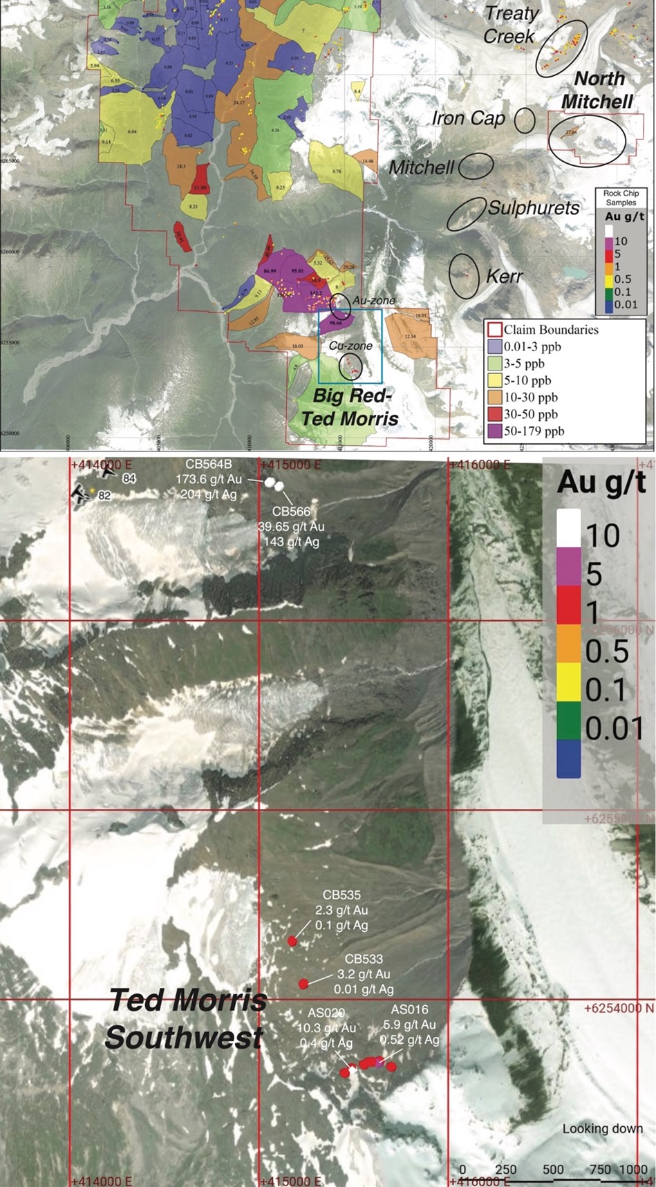The North Mitchell and Ted Morris showings lie along a larger northeast-southwest trend of Cu-Au porphyry deposits that includes KSM, Iron Cap, and Treaty Creek (Figure 1) that comprise a total indicated Au resource of over 100 million ounces, and a Cu resource of over 20 billion pounds. Prospecting and BLEG surveys of North Mitchell, Big Red, and Ted Morris shows high Au and Cu concentrations associated with the chalcopyrite, bornite, and chalcocite. BLEG anomalies between Ted Morris and Kerr suggest that this area has widespread potential for Cu-Au porphyry deposits.