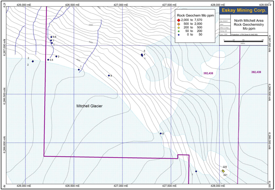 Figure 10: Results of Mo assays for rock chip samples from the 2016 prospecting program in the southwestern portion of the North Mitchell claims.