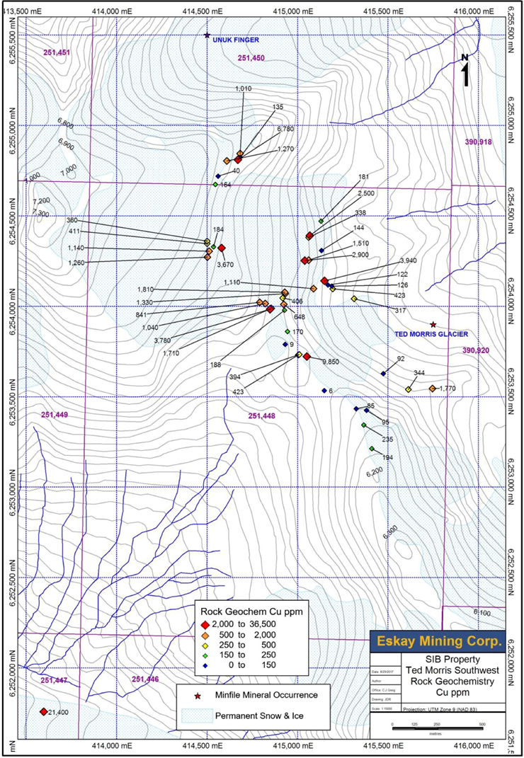 Figure 9: Results of Cu assays for rock chip samples from the 2016 prospecting program in the southwestern portion of the North Mitchell claims (1,000 ppm=0.1%).
