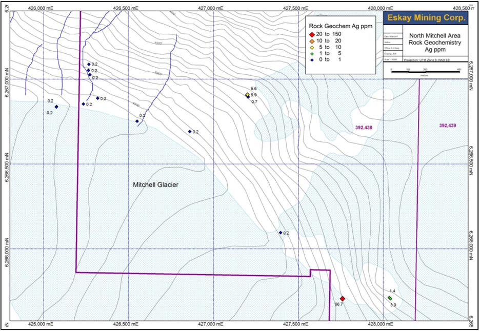 Figure 8: Results of Ag assays for rock chip samples from the 2016 prospecting program in the southwestern portion of the North Mitchell claims.